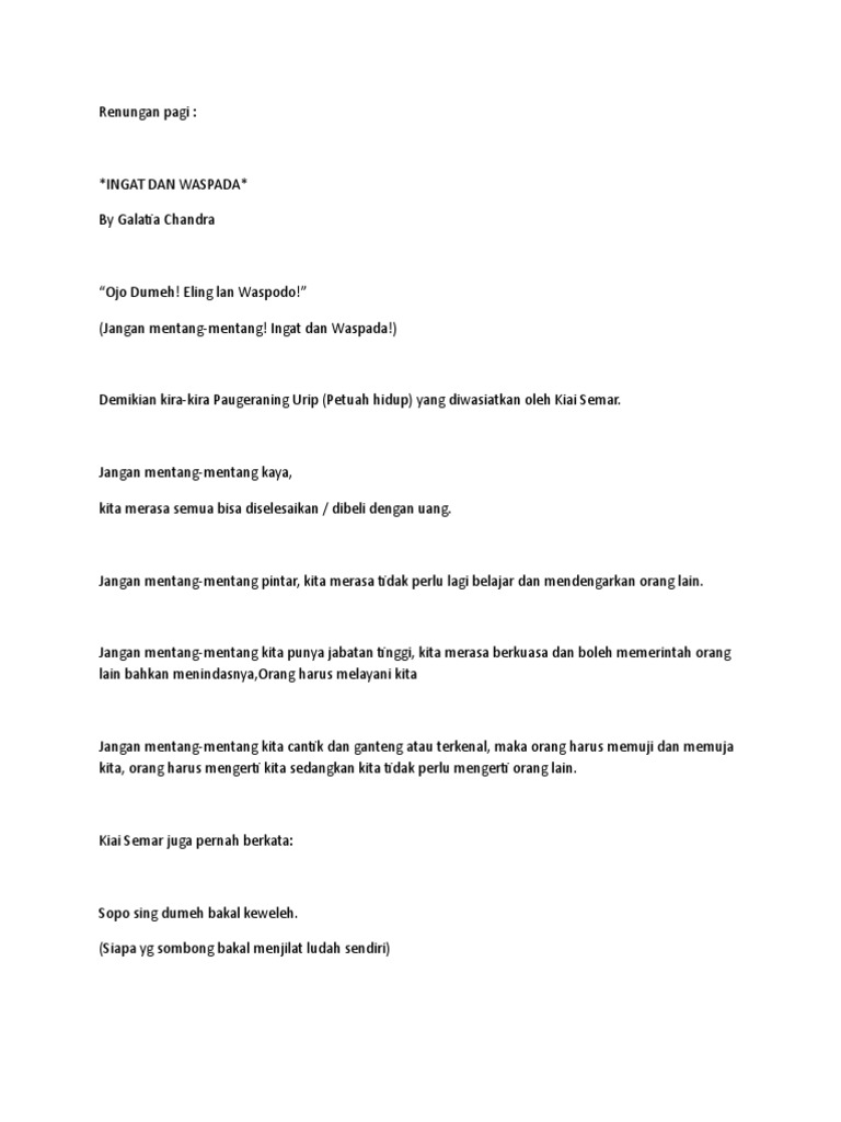 Awasono atimu dewe dewe karo lan waspodo tondo tondo sing digelar gusti murbeng jagad. Ojo dumeh eling lan waspodo kejawen iku dudu agama agama iku nduwe nabi agama iku nduwe kitab suci agama iku saka manca iya apa ora. Elingo kowe kabeh kui sopo.